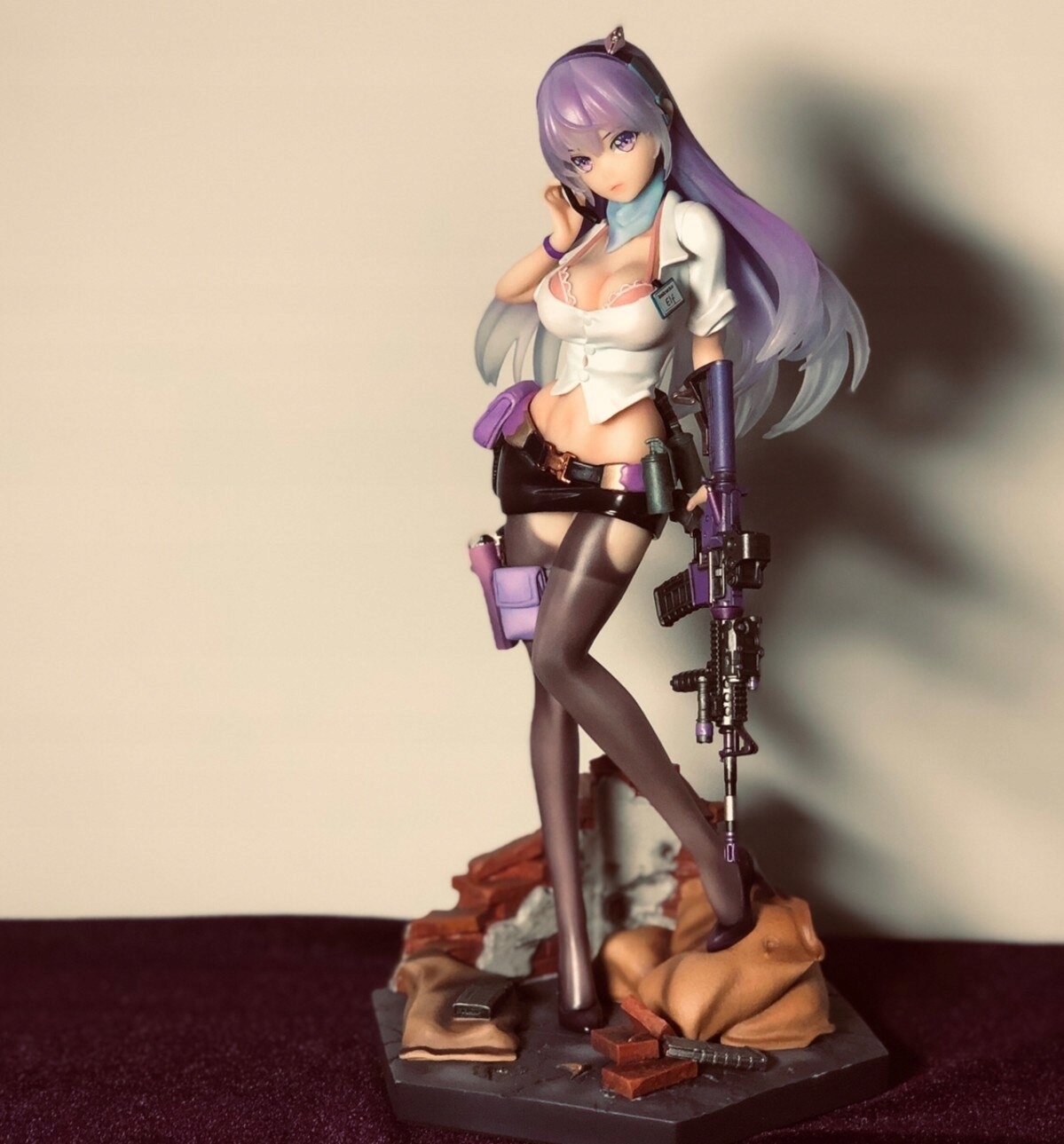 Realistická figurka představující sexy dívku se zbraní v skromném oblečení